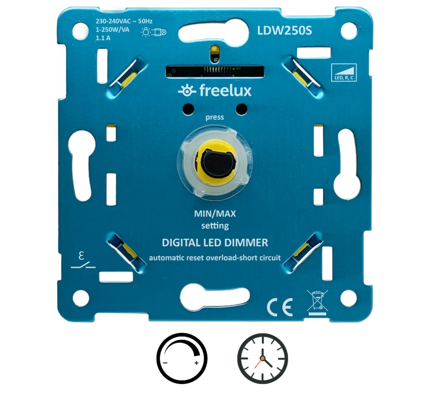 De digitale led-dimmer 250 watt is een 2-draadsdimmer met soft-start en geschikt voor het dimmen van alle typen dimbare ledlampen (fase-afsnijding).